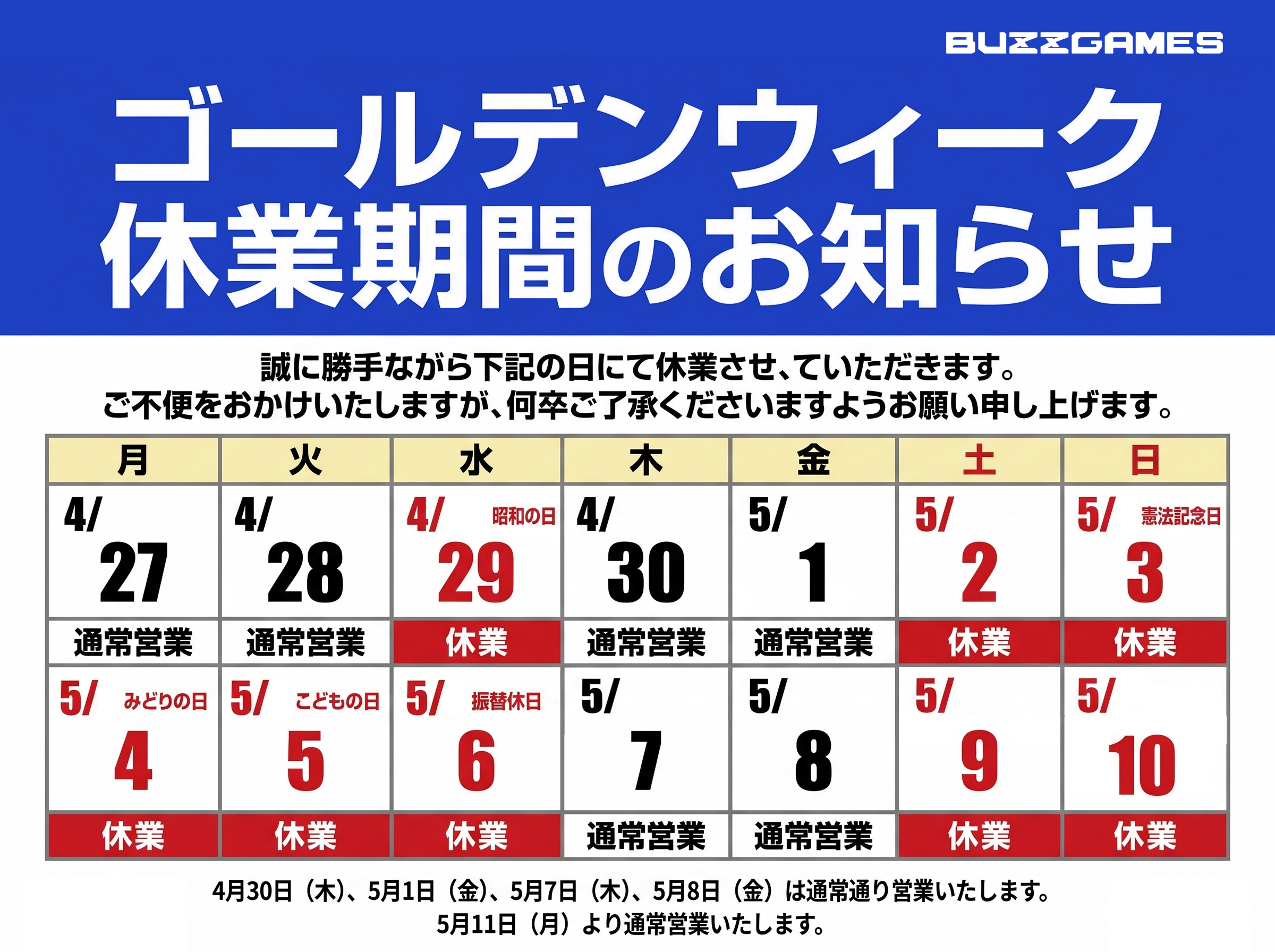 平素は格別のご愛顧を賜り、厚く御礼申し上げます。 誠に勝手ながら、弊社では2026年のゴールデンウィーク期間中、以下の通り休業させていただきます。