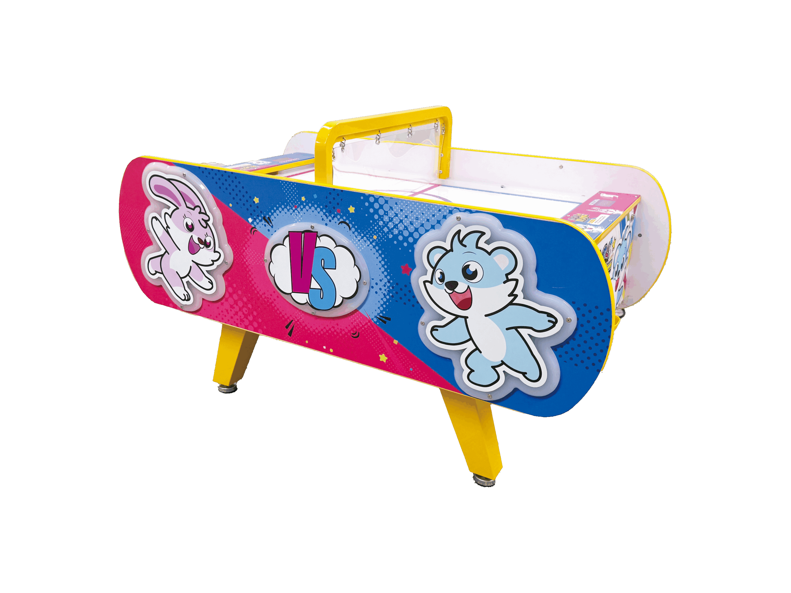 プレイフィールド全面にLEDを使用したコンパクトなエアホッケーマシン。得点時やパックが壁に当たった際には、LEDと可愛らしいサウンドでリアクション。中央に透明プレートを採用し、パックの飛び出しを防ぐ安全設計です。