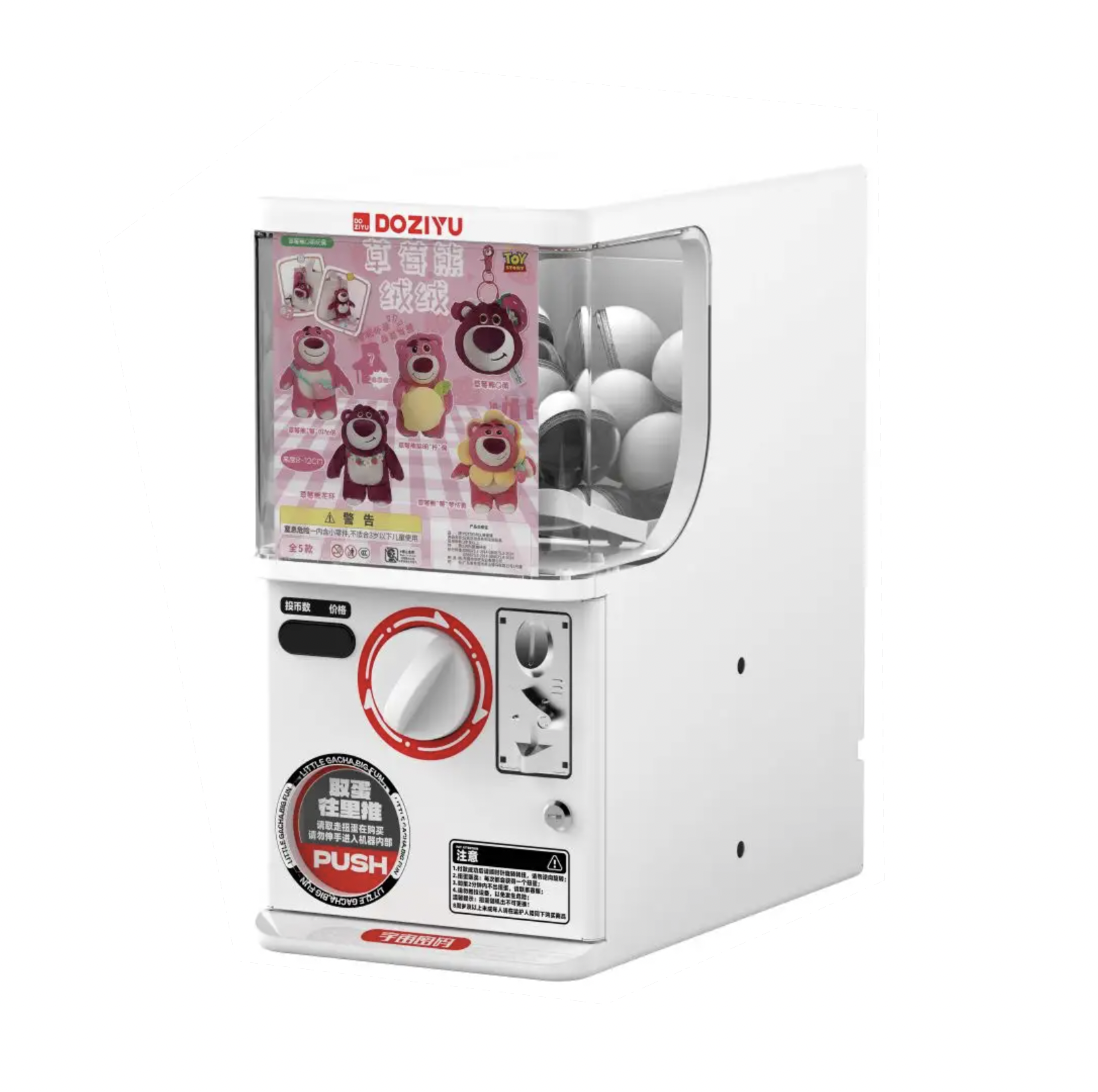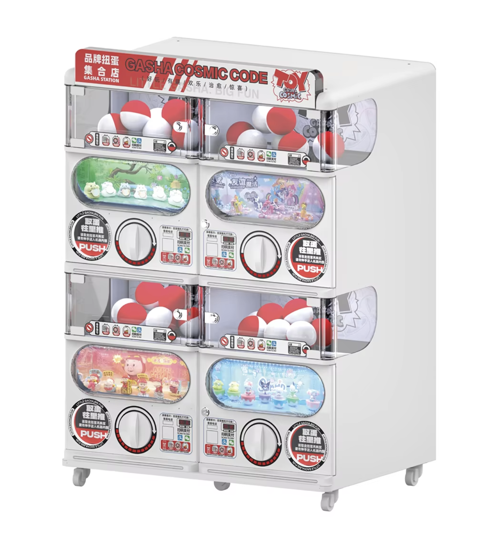 通常のカプセル販売機よりもコンパクトなサイズ(幅28cm・奥行45cm・高さ56cm)が特長です。最大3段まで積み重ねて設置できるため、省スペースながら多くの種類を取り扱うことが可能です。