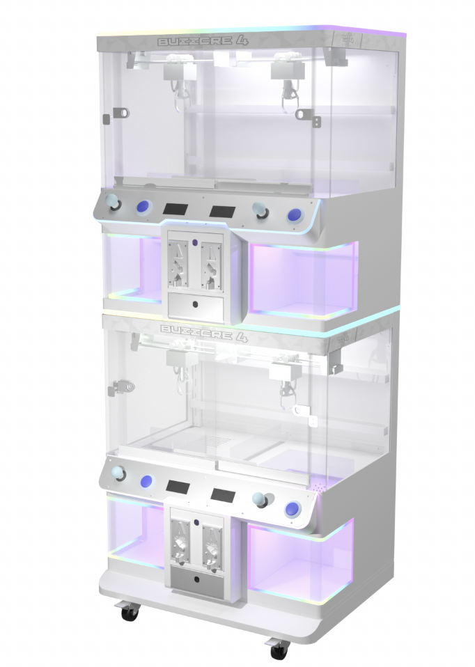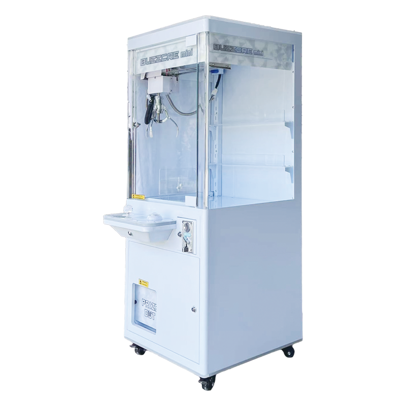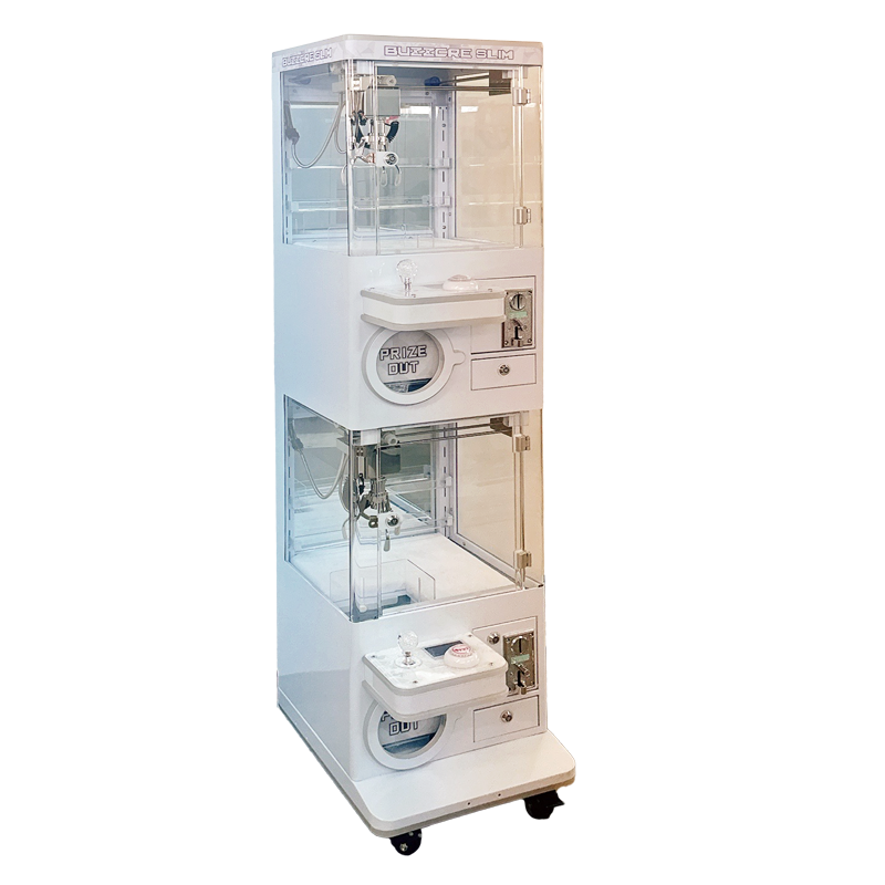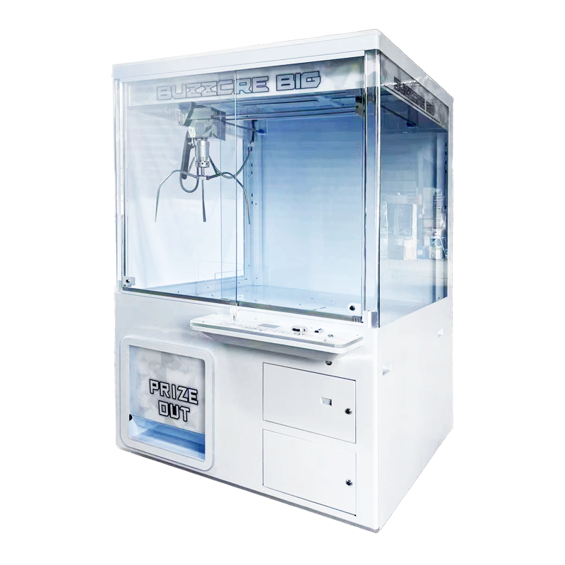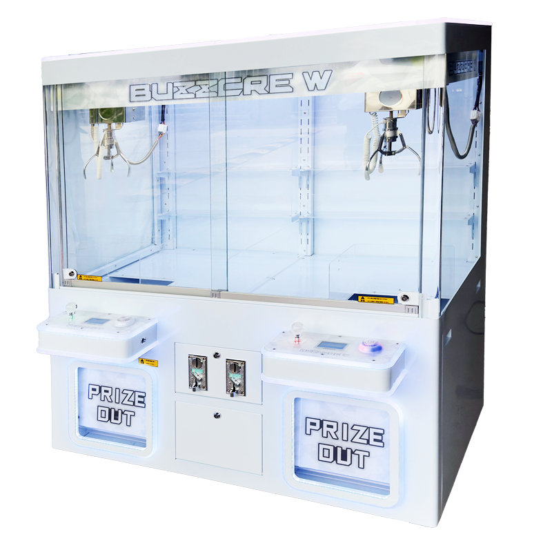 ミニクレーンマシンの「単価が低い小物景品しか扱えない」という課題を解決した一台。従来のBUZZCRE4とほぼ同じサイズながら、景品出口とアームサイズを拡大することで、中型サイズの景品にも対応可能になりました。