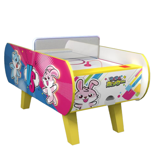 プレイフィールド全面にLEDを使用したコンパクトなエアホッケーマシン。得点時やパックが壁に当たった際には、LEDと可愛らしいサウンドでリアクション。中央に透明プレートを採用し、パックの飛び出しを防ぐ安全設計です。